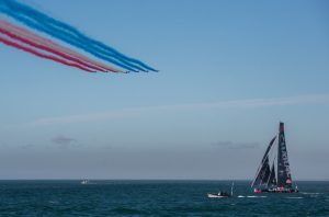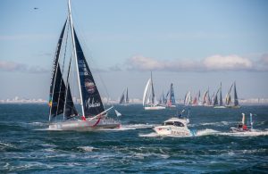 Repoussé à 4 reprises, le top départ a été lancé à 14h20 au lieu de 13h02 à cause des conditions météorologiques défavorables. Un épais brouillard était présent du la ligne de départ réduisant la visibilité et augmentant considérablement le risque de collision des Imocas. Malgré l’AIS (automatic Identification System) présent à bord, les Imocas sont des bateaux qui nécessitent une visibilité totale pour effectuer les manœuvres. La ligne de départ de 1,3 miles, soit environ 2 km, a finalement été franchie en premier par Louis Burton – Bureau Vallée, mais quelques secondes trop tôt. Cela lui a couté une pénalité de 5 heures, durant lesquelles il a du stopper sa course. Il en a d’ailleurs profité pour réparer quelques avaries. C’est toute la difficulté du départ, ce n’est pas évident de calculer sa course à la seconde près avec des voiliers de 60 pieds (18,28 m) lancés à pleine vitesse.