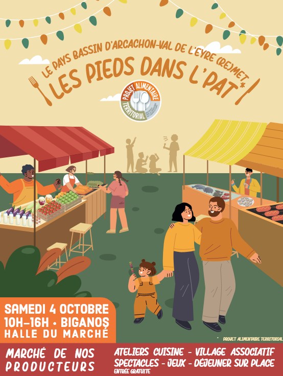 Le Pays Bassin d’Arcachon-Val de l’Eyre remet « les pieds dans l’pat » le samedi 4 octobre 2025, sous la halle du marché de Biganos, pour la troisième édition de la Fête du Projet Alimentaire Territorial (PAT). De 10 h à 16 h, habitants et visiteurs sont invités à une journée gratuite et conviviale, placée sous le signe du goût, de la rencontre et du savoir-faire local.