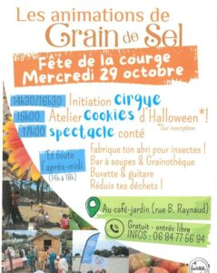 Grain de Sel vous convie au Café-Jardin pour la fête de la Courge avec initiation cirque, fabrication de cookies, spectacle conté, bar à soupe, grainothèque, etc