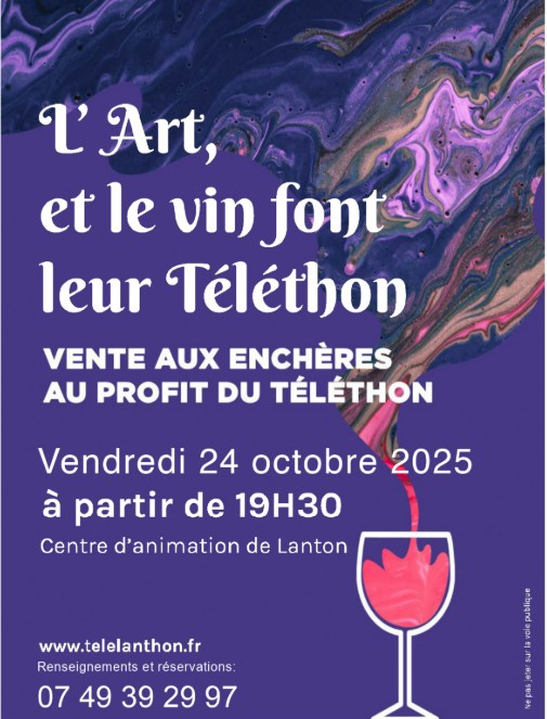 Le comité d’organisation du Téléthon de Lanton organise une soirée de vente aux enchères d’oeuvres d’Art et de flacons de grands vins, dans le cadre du Téléthon 2025. Une soirée conviviale autour de la gastronomie et du vin. L’intégralité des sommes récoltées lors de la vente aux enchères sera reversée au profit du Téléthon.