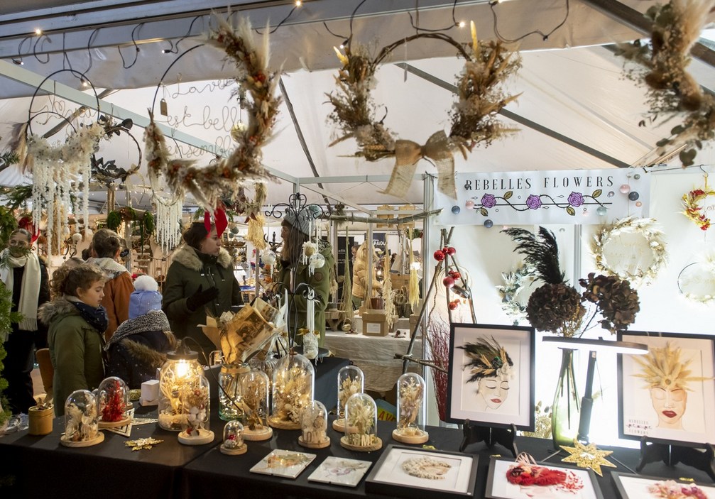 Divers créateurs présentent leur production. De quoi dénicher un cadeau insolite pour les fêtes de Noël. Stand de crêpes et boissons chaudes. Manège .