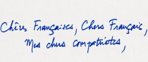 Chères Françaises, chers Français, mes chers compatriotes, je souhaite que le plus grand nombre d’entre vous puisse participer à ce grand débat afin de faire œuvre utile pour l’avenir de notre pays.