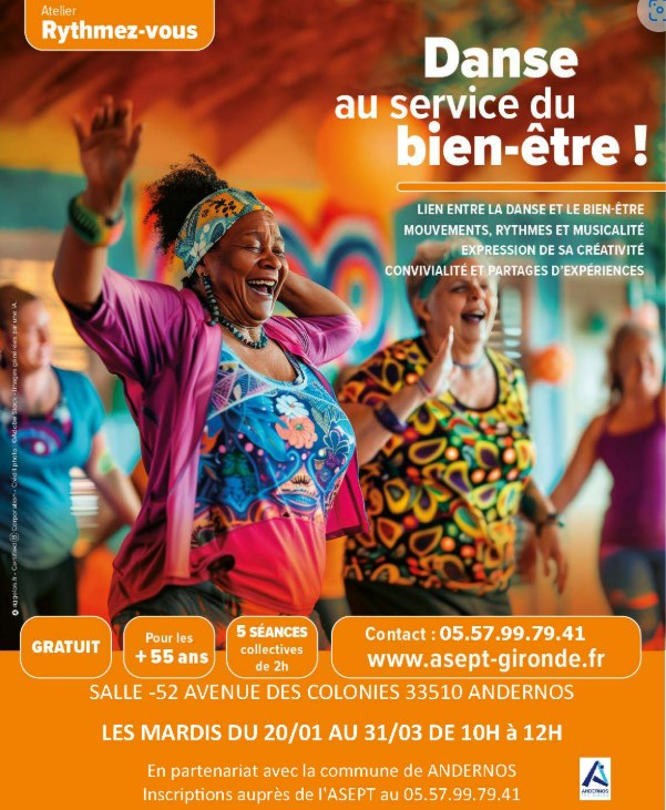 Pour la première fois L’ASEPT en partenariat avec la Ville d’Andernos, propose un atelier gratuit « Rythmez-vous ». Accessible tous niveaux, les 5 séances collectives sont animées par des professionnels. De 10h à 12h tous les mardis du 20/01 au 30/03. Sur inscription au cycle complet auprès de l’ASEPT (Association Santé Éducation et Prévention sur les Territoires) au 05.57.99.79.41.