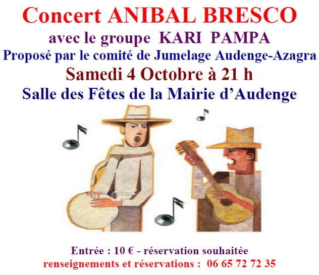 Audenge : Concert ANIBAL BRESCO avec le groupe KARI PAMPA « Quatre pays pour un seul langage, la Musique ». Organisé par le Comité de jumelage Audenge-Azagra. IB Pratic : Salle des Fêtes, Allée de Boissière. Tel 06 65 72 72 35. Tarif : 10,00€.
